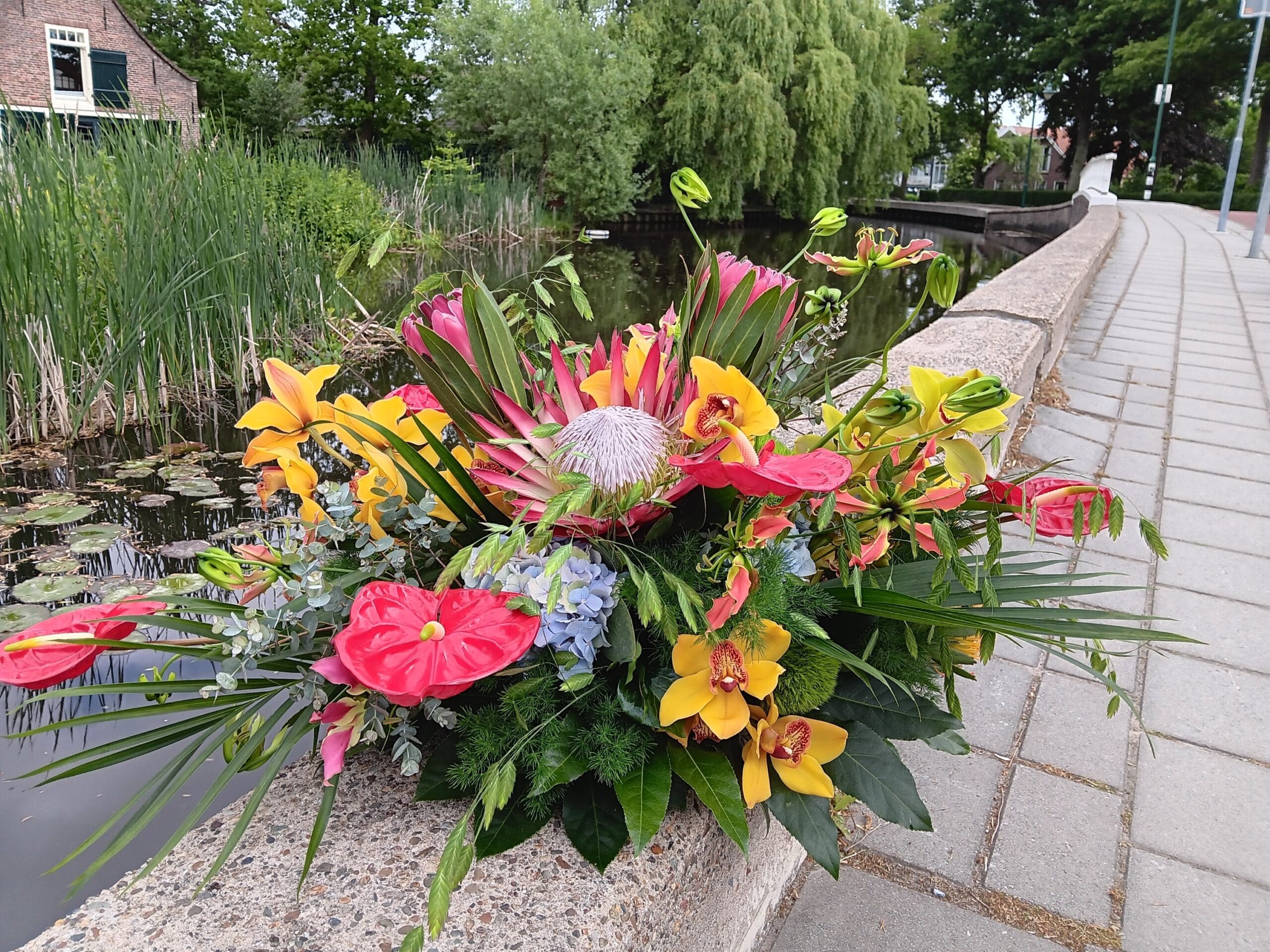 Kleurig rouwarrangement met een mix van diverse exotische bloemen*